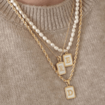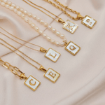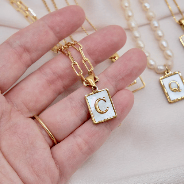 18K Gold Mother of Pearl Initial Necklace, featuring a personalized letter charm. This elegant gold initial necklace is perfect for custom name jewelry and makes a beautiful layering piece.